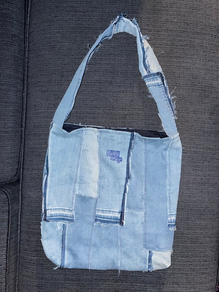 1/1 handmade denim tote bag made from recycled denim, includes a magnetic closure