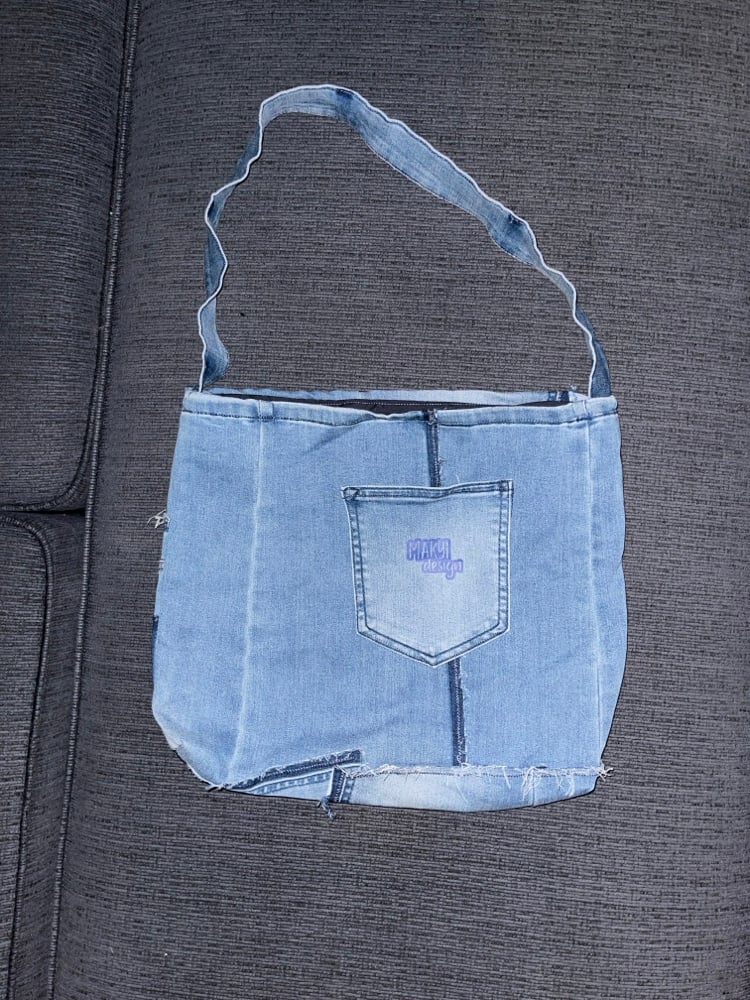 1/1 handmade denim tote bag made from recycled denim, includes a magnetic closure