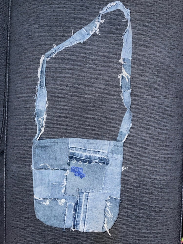 1/1 handmade denim tote bag made from recycled denim, includes a magnetic closure